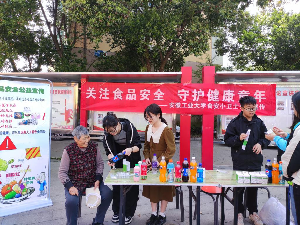 活动中,志愿者们立足专业,深入了解社区居民日常膳食及对食品安全知识的关注程度,并通过发放精心准备制作的食品安全日常小常识手册普及食品安全知识。在活动展台宣传处,吴孔林为社区居民介绍了食品色素在工业中是如何生产、如何运用在不同食品中,并普及了常用食品添加剂的国标添加量及过度使用的潜在危害。王双寿带来了团队研发的染料可视化快检试纸,介绍了该试纸的使用原理,由志愿者现场对可乐、果汁、复原乳等饮品中食品色素添加情况进行测试,并和社区居民进行了深入互动,针对社区居民们提出的每一个问题,志愿者们都给予了认真细致专业的解答,同学们过硬的专业知识和饱满的服务热情得到了大家的充分肯定和赞赏。